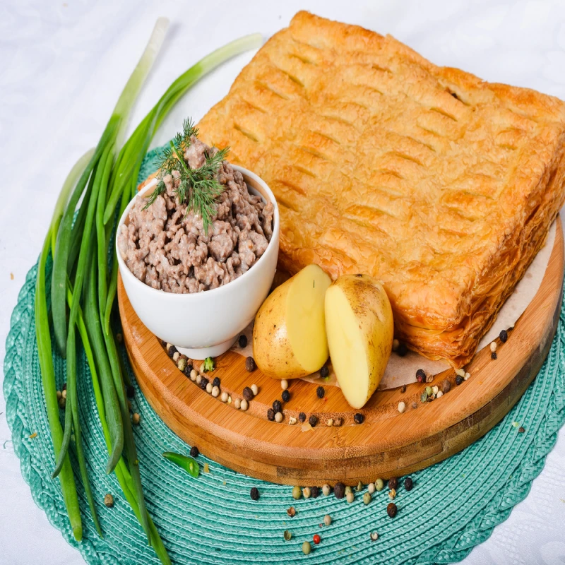 Фарш говядина+свинина, картофель, лук репчатый, сливочное масло, специи